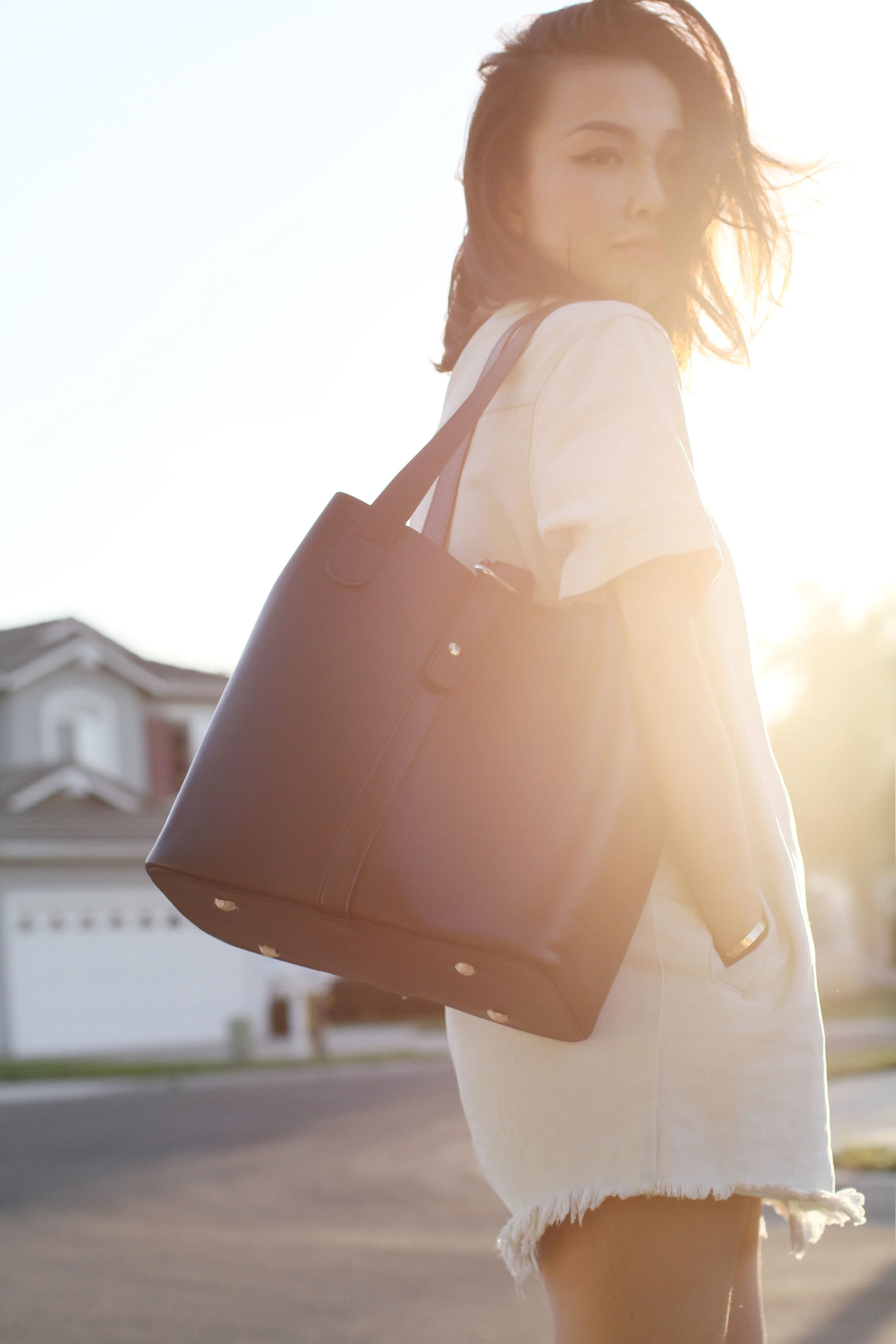 I went back to California last week for work/visiting family, and I have got to say it felt great to be home! I could finally laid on the bench in my backyard and fell asleep in the sun, getting all the Vitamin D my body needs. On the days with no meetings, I wore a simple one piece, like this loose fit denim shirt dress with sneaker and a simple yet functional tote bag. I especially love this one bag because: