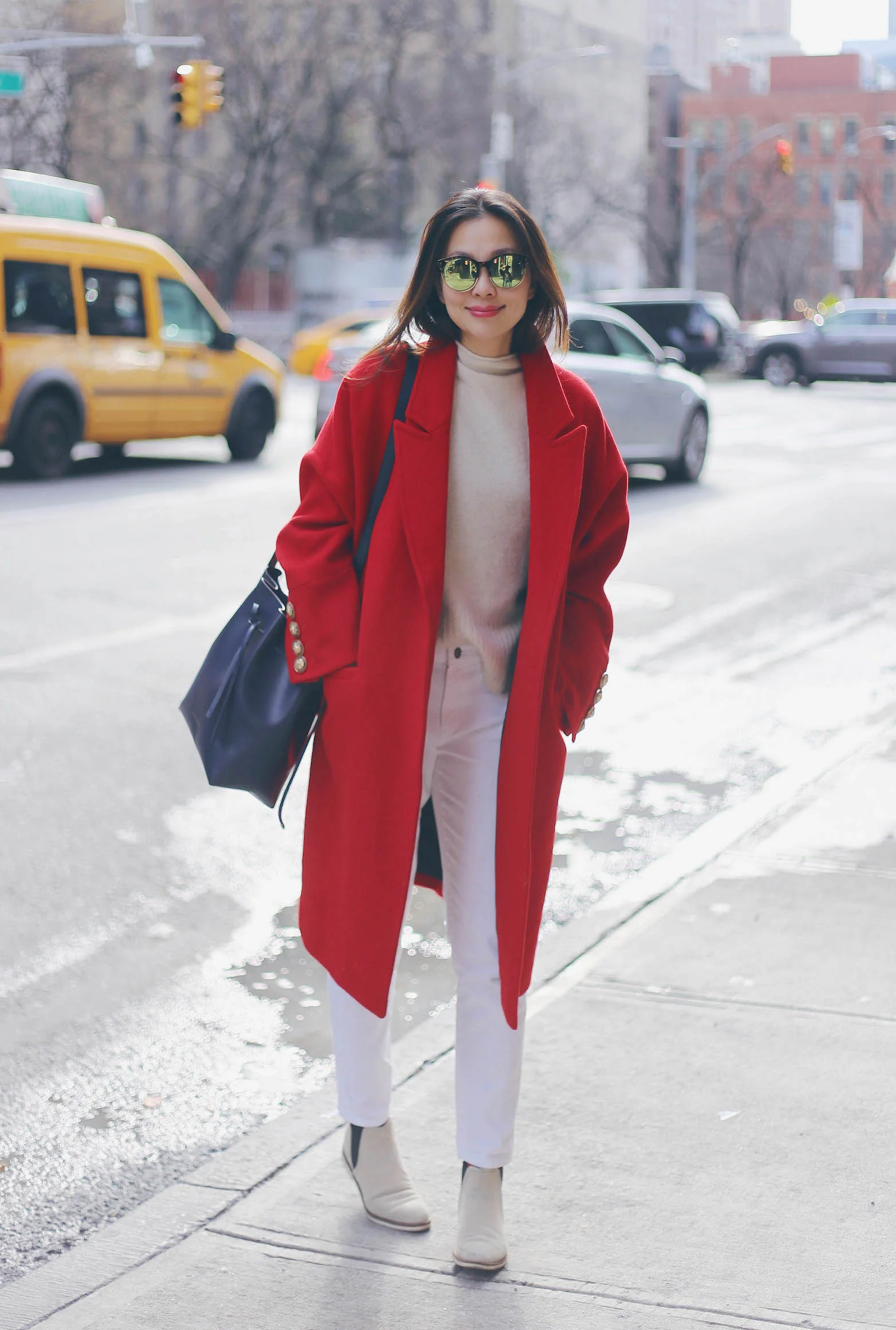 The camel coat trend was and still is an "IT" trend, different from the previous seasons, a darker shade is in! The chestnut color is so rich and luxe, it totally bring out the lush and soft texture of a good coat. It think it's fair to say that everyone needs a comfortable, practical and pretty coat that you can just grab and go. Most people would think a "shapeless" oversized coat is quite scary to try because it really makes people look short and chubby if worn incorrectly. This particular chestnut cashmere robe is basically a gigantic piece of fabric, but when you roll up the sleeves, it creases perfectly to give that structural yet relax look. I literally wear it EVERYDAY this winter. It's just divine.
