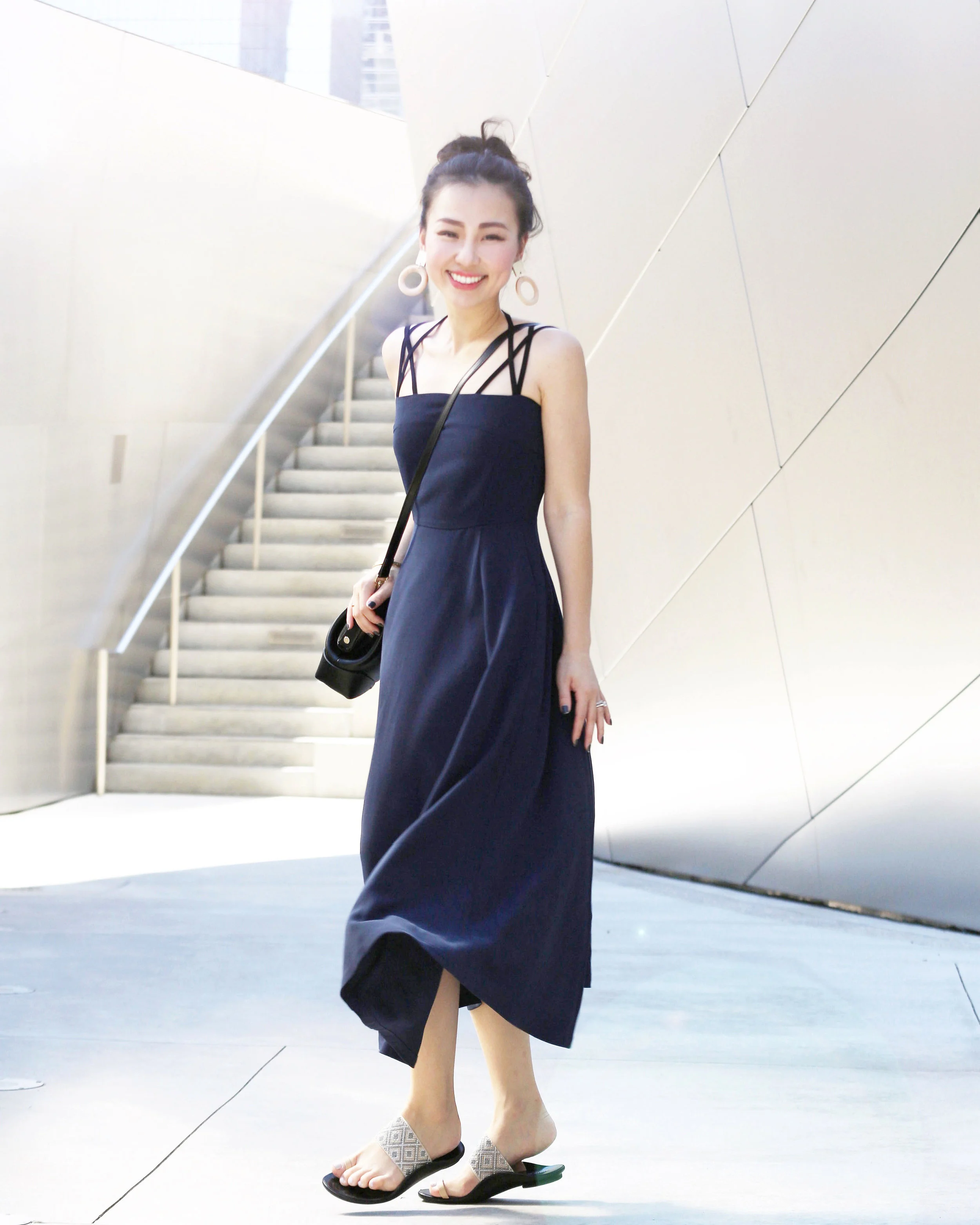 The goal here is to find a casually elegant outfit that has some bold details. And I think this navy midi dress from Dezzal is just that. The midi length is eternally elegant, and the cutoff top injects some unique and playful elements. These wood earrings adds a touch of summer..